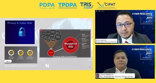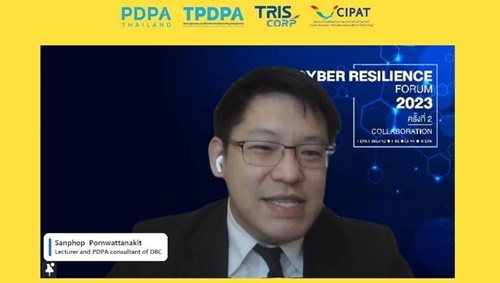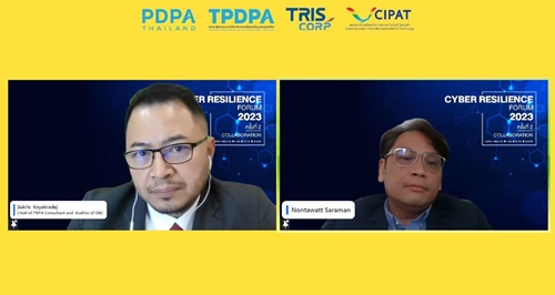บริษัท ทริส คอร์ปอเรชั่น จำกัด (ทริส) ร่วมกับบริษัท ดิจิทัล บิสิเนส คอนซัลท์ จำกัด (DBC) และสมาคมส่งเสริมนวัตกรรมเทคโนโลยีไซเบอร์ (CIPAT) จัดงาน Cyber Resilience Forum 2023 EP.2 : One Year of PDPA: A Look Back and A Look Forward เหลียวหลัง แลหน้า 1 ปี การคุ้มครองข้อมูลส่วนบุคคลหลังกฎหมายมีผลบังคับใช้ เมื่อวันที่ 20 เมษายน 2566 ในรูปแบบออนไลน์ (Zoom Webinar) งานสัมมนาครั้งนี้มีผู้ทรงคุณวุฒิและผู้เชี่ยวชาญด้านการคุ้มครองข้อมูลส่วนบุคคล มาร่วมแบ่งปันความรู้ และกรณีตัวอย่างจากประสบการณ์ตรง รวมถึงการเตรียมความพร้อมให้องค์กรปฏิบัติงานได้อย่างสอดคล้องกับ พ.ร.บ. คุ้มครองข้อมูลส่วนบุคคล โดย ดร.อุดมธิปก ไพรเกษตร ประธานเจ้าหน้าที่บริหาร บริษัท ดิจิทัล บิสิเนส คอนซัลท์ จำกัดนายกสมาคมผู้ตรวจสอบและให้คำปรึกษาการคุ้มครองข้อมูลส่วนบุคคลไทย (TPDPA) ได้กล่าวต้อนรับวิทยากรและผู้เข้าร่วมงานสัมมนา ในช่วงการเสวนาได้รับเกียรติจากผู้บริหารและผู้เชี่ยวชาญด้านการคุ้มครองข้อมูลส่วนบุคคล ประกอบด้วย ดร.ศิวรักษ์ ศิวโมกษธร เลขาธิการสำนักงานคณะกรรมการคุ้มครองข้อมูลส่วนบุคคล อาจารย์สันติภพ พรวัฒนะกิจ ที่ปรึกษาและวิทยากรสถาบันพัฒนาและดสอบดิจิทัล (DDTI) อุปนายกสมาคมผู้ตรวจสอบและให้คำปรึกษาการคุ้มครองข้อมูลส่วนบุคคลไทย (TPDPA) คุณนนทวัตต์ สาระมาน นายกสมาคมส่งเสริมนวัตกรรมเทคโนโลยีไซเบอร์ (CIPAT) คุณจุฑาวิชญ์ มาลาหอม รองผู้อำนวยการสายงานที่ปรึกษา บริษัท ทริส คอร์ปอเรชั่น จำกัด (TRIS) โดยมีอาจารย์สุกฤษ โกยอัครเดช ผู้บริหารงานฝ่ายที่ปรึกษาและตรวจสอบ PDPA บริษัท ดิจิทัล บิสิเนส คอนซัลท์ จำกัด (PDPA Thailand) เลขาธิการสมาคมผู้ตรวจสอบและให้คำปรึกษาการคุ้มครองข้อมูลส่วนบุคคลไทย (TPDPA) เป็นผู้ดำเนินรายการท่านสามารถติดตามข้อมูลข่าวสารได้ทั้งทางเว็บไซต์ www.tris.co.th, Facebook Page : TRIS Corporation และ LINE OA: @tris