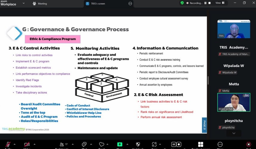 สถาบันวิทยาการจัดการ ทริส คอร์ปอเรชั่น ได้จัดหลักสูตรฝึกอบรมการบูรณาการกำกับดูแลกิจการที่ดี การบริหารความเสี่ยง และการควบคุมภายใน (Governance Risk and Compliance) ในรูปแบบออนไลน์ เมื่อวันที่ 5 กันยายน โดยได้รับเกียรติจากอาจารย์สุรพงษ์ ชูรังสฤษฎิ์ วิทยากรที่ปรึกษาสถาบันวิทยาการจัดการ อดีตคณะอนุกรรมการ Certified Anti-Corruption ของ IOD เป็นวิทยากรผู้เชี่ยวชาญถ่ายทอดแนวคิดการจัดการแบบบูรณาการเชิงรุก เพื่อเสริมสร้างความรู้ความเข้าใจในความสัมพันธ์และการบูรณาการระหว่างการกำกับดูแลกิจการที่ดี การบริหารความเสี่ยง และการควบคุมภายในอย่างครบถ้วนและเป็นระบบ