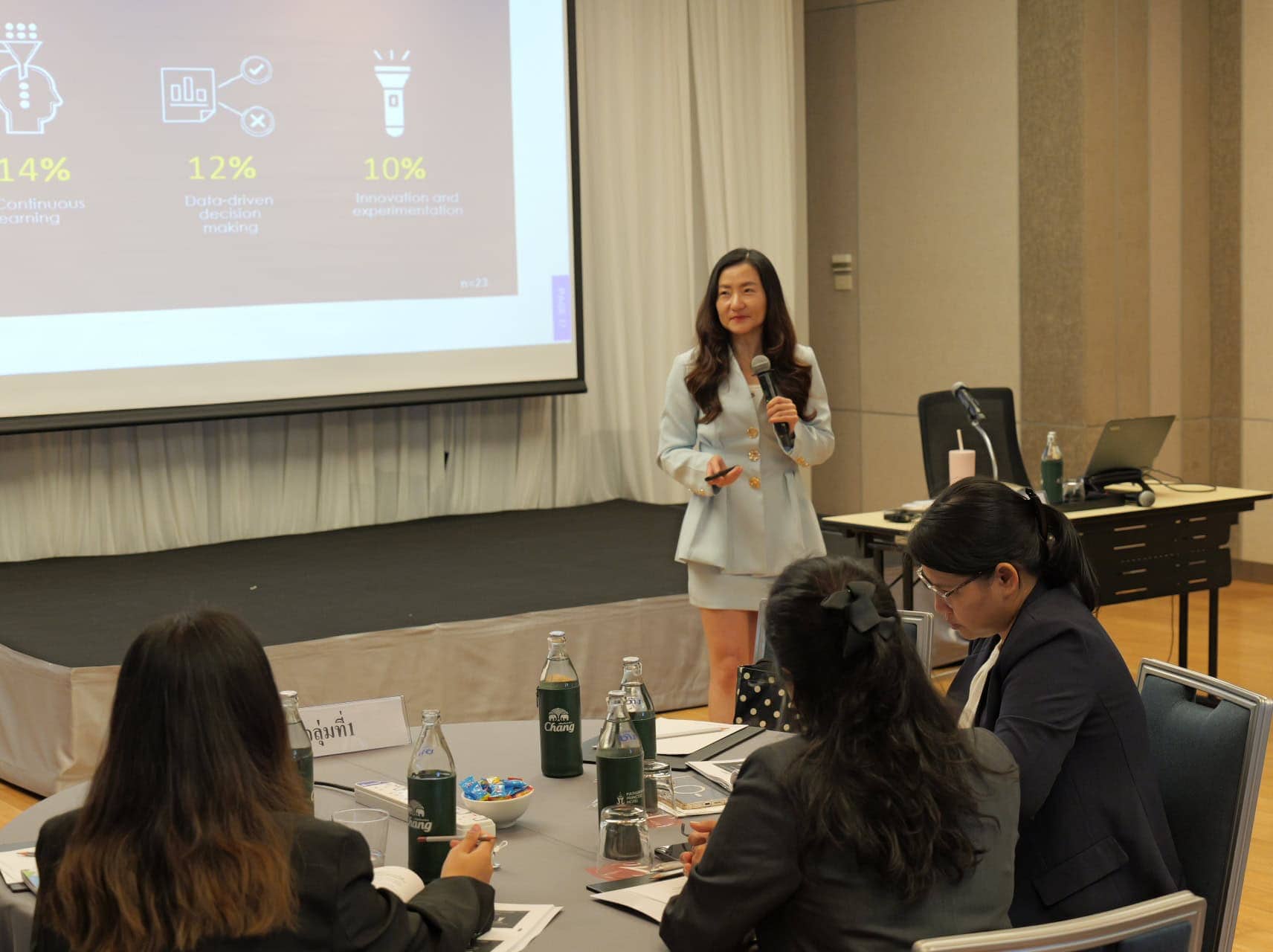 บรรยายโดย คุณพลอยณิชชา จารุหิรัญสกุล ผู้อำนวยการอาวุโส TRIS Academy และวิทยากรที่ปรึกษาผู้เชี่ยวชาญด้าน KM มาเป็นผู้ถ่ายทอดความรู้ โดยได้แชร์เทคนิคการสร้างวัฒนธรรมแห่งการแบ่งปันที่ยั่งยืน และการวางโครงสร้างระบบ KM ให้สอดคล้องกับผลการดำเนินงานขององค์กรในยุคปัจจุบัน