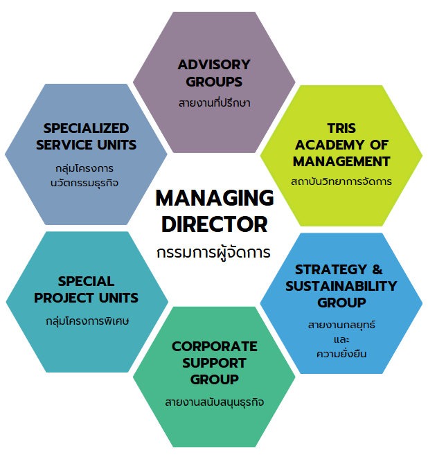 Trust in TRISคณะกรรมการบริษัทกรรมการผู้จัดการคณะผู้บริหารและที่ปรึกษาแผนผังองค์กรมาตรฐานเครือข่ายและพันธมิตร