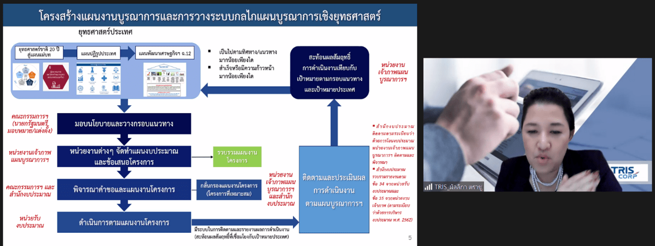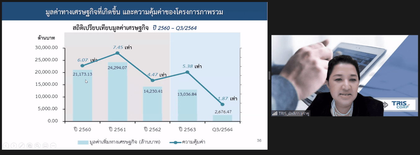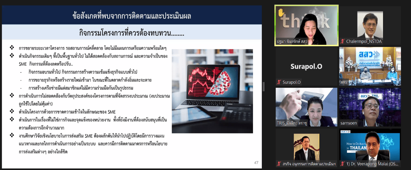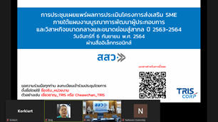 วันจันทร์ที่ 6 กันยายน 2564 เวลา 13.00 – 17.00 น. ทริสและ สสว. ได้จัดประชุมเผยแพร่ผลการประเมินและรับฟังความคิดเห็นผลการประเมินโครงการส่งเสริม SME ภายใต้แผนงานบูรณาการผ่านระบบสื่ออิเล็กทรอนิกส์ (ออนไลน์) โดยในการประชุมมีคณะกรรมการบริหาร สสว. ผู้บริหาร สสว. ผู้แทนจากสำนักงบประมาณ ผู้แทนจากสภาพัฒนาการเศรษฐกิจและสังคมแห่งชาติ และหน่วยรับงบประมาณภายใต้แผนงานบูรณาการ ปีงบประมาณ 2563-2564 รวมจำนวน 31 หน่วยงาน มีผู้เข้าร่วมการประชุมทั้งสิ้น 218 คน นายสรรเสริญ สงวนศักดิ์ รองกรรมการผู้จัดการ ได้กล่าวถึงความสำคัญของข้อมูล SME ที่จะนำมาใช้ในการวิเคราะห์ข้อมูลออกแบบเพื่อการตัดสินใจเชิงนโยบายได้อย่างถูกต้อง การติดตามประเมินผลในครั้งนี้มีความสำคัญ มุ่งหวังให้หน่วยงานที่เกี่ยวข้องกับการส่งเสริม SME ได้นำมาทบทวนแผนงานและทิศทางการดำเนินงานในระยะต่อไป นางสาวมัลลิกา ตราชู รองผู้อำนวยการ ได้นำเสนอผลการประเมินซึ่งโดยภาพรวมพบว่า SME อยู่ระหว่างการเจอความท้าทายอย่างสูง ภาครัฐที่เกี่ยวข้องต้องปรับตัวได้เร็ว พยายามเร่งแก้ปัญหาพัฒนาปรับงานให้รองรับกับสถานการณ์และมองหาโอกาสที่เปลี่ยน และได้ให้ข้อเสนอแนะในการเร่งแก้ไขปัญหาและลดผลกระทบให้ SME โดยมุ่งเน้นการสร้างรายได้ กระแสเงินสด และต้นทุน เป็นลำดับสำคัญ รวมทั้งเตรียมแผนฟื้นฟูด้านการตลาดรองรับเมื่อสถานการณ์คลี่คลาย ตลอดจนจะต้องมีการวางแนวทางการพัฒนาการพัฒนารูปแบบแนวทาง หรือมาตรการในการสนับสนุนส่งเสริมให้หลากหลายเหมาะสมกับผู้ประกอบการแต่ละกลุ่ม โดยเป้าหมายเพื่อให้เกิดความส่งเสริมเพื่อรองรับอนาคต การพัฒนาเครื่องมือ มาตรการต่างๆ ให้หลากหลาย อาทิ การส่งเสริมการพัฒนาธุรกิจ (Business Development Service: BDS) การส่งเสริม Trader เอกชน เพื่อมาช่วยด้านการตลาด การเป็นที่ปรึกษาในการวาง Business Model การให้คำปรึกษาแนะนำการตลาด การปรับปรุงธุรกิจ ปรับแผนธุรกิจต่างๆ เน้นการร่วมมือภาคเอกชน และร่วมมือกับสถานประกอบการขนาดใหญ่ที่มีความเป็นมืออาชีพเป็นพี่เลี้ยง การพัฒนาเครื่องมือ (Platform) ในการให้ SME ประเมินตนเอง เพื่อวิเคราะห์ Gap และส่งต่อพัฒนาในโปรแกรมที่เหมาะสม และการวางแผนเชิงนโยบายและแก้ไขปัญหาต้องใช้ข้อมูลของ SME และข้อมูลการเข้ารับการพัฒนาจากภาครัฐจึงจำเป็นเชื่อมโยงฐานข้อมูลที่สำคัญอย่างเป็นระบบ เป็นต้น