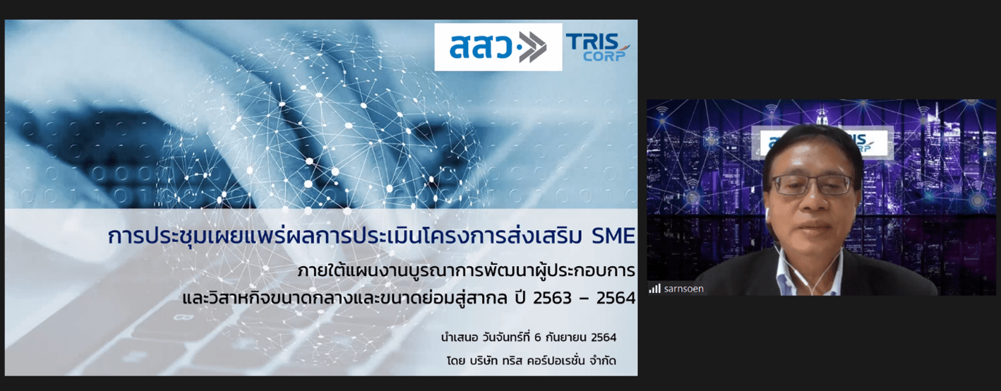 Home » ทริสร่วมกับ สสว. จัดประชุมเผยแพร่ผลการประเมินโครงการส่งเสริม SME ภายใต้แผนงานบูรณาการพัฒนาผู้ประกอบการและวิสาหกิจขนาดกลางและขนาดย่อมสู่สากล ปี 2563 – 2564